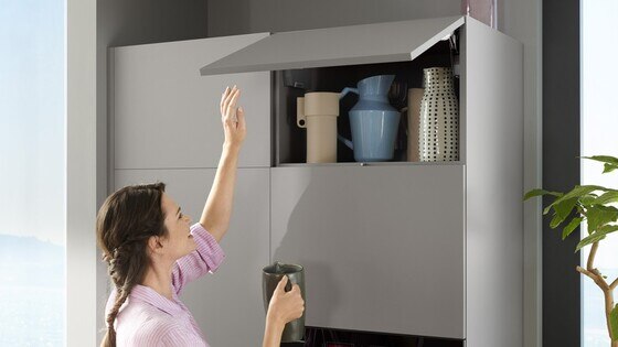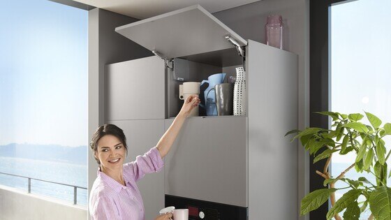 Mit dem Hochklappenbeschlag AVENTOS HK-S lässt sich Stauraum optimal nutzen, z. B. über dem Kühl- oder dem Vorratsschrank. Dabei fügt sich der kompakte Kraftspeicher harmonisch in kleine Korpusse ein und überzeugt durch hohen Montage- und Bedienkomfort.