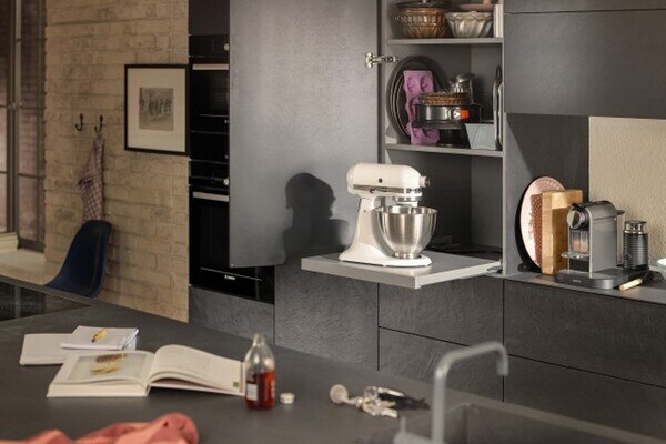 The Pull-out shelf lock is an easy-to-implement and easy to use solution that locks securely in position creating additional worktop space. The new Pull-out shelf lock has a two-sided locking mechanism which can be easily released with one hand thanks to a synchronisation shaft. It is held securely in place when items or appliances are placed on top for as long as it is required and does not slide back into cabinets.