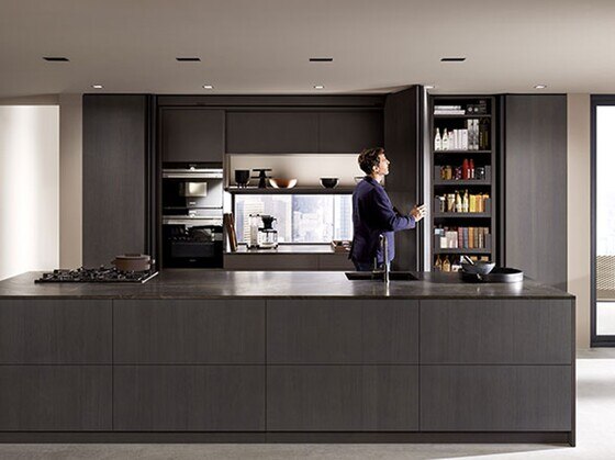 "With the new version of REVEGO, your creativity is practically limitless when it comes to the versatile use of living spaces," stresses product manager Patrick Fussenegger. A large wardrobe or hallway storage unit, both of which take up the entire room height, can now be planned as easily as a low worktop-mounted cabinet, for example, in which you can conceal a coffee bar or even a TV. The new, optimised version of the pocket system can even be used as a type of access door – without an inner cabinet. This enables walk-in applications, i.e. access to separate living areas, such as a pantry, an office or a walk-in wardrobe.