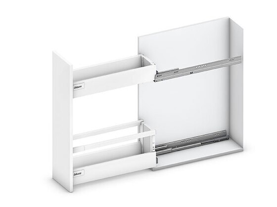 Dosljedna upotreba okova Blum omogućava primjenu sustava uski ormari SPACE TWIN s postojećim programom. Rješenje za uske ormare moguće je realizirati s pomoću box sustava LEGRABOX i TANDEMBOX te s pomoću sustava vodilica MOVENTO.