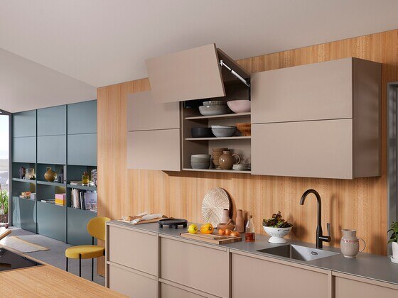 S pomoću okova za kapke AVENTOS možete vješto oblikovati pojedinačne komade namještaja ili cijele stambene prostore: Bilo da se radi o sklapanju, zakretanju, podizanju ili preklapanju – osigurajte veliku udobnost kretanja u gornjem ormariću. S pomoću integriranog preklopa AVENTOS HKi postići ćete izvanredan dizajn. Nudimo odgovarajuće rješenje čak i za najmanje preklope. Zahvaljujući sustavu AVENTOS krajnji će rezultat biti skladan.