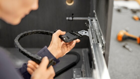 U hebt geen gereedschap nodig om de kabelgeleider te installeren - u sluit hem gewoon aan met de TIP-ON BLUMOTION-interface.