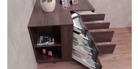 Com alta qualidade de movimento, extensões bastante carregadas são abertas facilmente. Além do sistema box TANDEMBOX ou gavetas de madeira com os sistemas de corrediças MOVENTO ou TANDEM, o armário é implementado de maneira flexível. A largura recomendada vai de 900 a 1.200 mm.