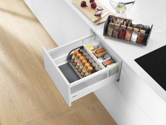 Com cubas, divisões para gavetas e divisores transversais e longitudinais para extensões, o sistema de divisões internas abre uma grande margem de composições na organização da parte interna de móveis. Para todas as linhas do programa TANDEMBOX, MOVENTO e TANDEM.