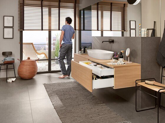 Furniture always closes softly and effortlessly thanks to integrated soft-close BLUMOTION. For handle-less fronts, simply combine MERIVOBOX with the SERVO-DRIVE electrical motion support system or the TIP-ON mechanical opening support system. Thanks to the identical fixing positions, your manufacturing processes are always the same – so the motion technologies can easily be retrofitted.