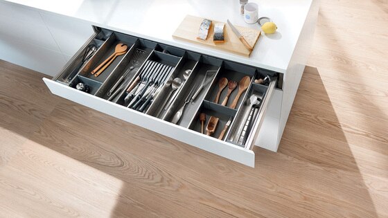 Avec les bacs et les casiers à ustensiles pour tiroirs ainsi que les séparateurs longitudinaux et transversaux, le système d'aménagement intérieur ouvre de nombreuses possibilités de conception pour une organisation parfaite à l'intérieur des meubles. Adapté à toutes les lignes de programme TANDEMBOX, MOVENTO et TANDEM.