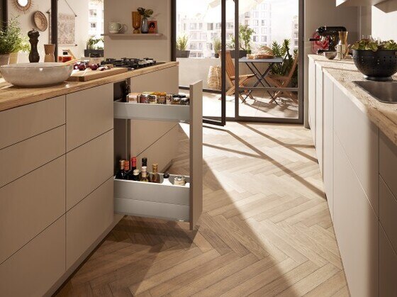 Den innovative L-form af korpusskinnerne gør MERIVOBOX usædvanlig stabil - også tungt læsset er MERIVOBOX overbevisende i enhver situation. Udover det synkroniserede letkørende løb åbner den høje frontstabilitet nye muligheder inden for køkkendesign - du kan nemt kombinere høje fronter med lave sider.
