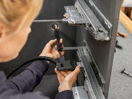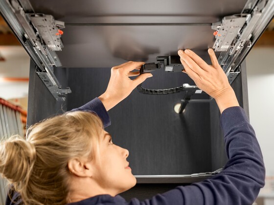 Uanset om det planlægges fra start eller blot eftermonteres: AMPEROS AC kan integreres i møbler med få trin, nemt og usynligt udefra ved hjælp af TIP-ON BLUMOTION-tilslutning.