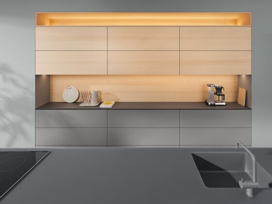 Dit køkkenkoncept bygger på horisontale fuger? Med AVENTOS kan overskabet overdrages med samme design, som i underskabet – uden at det vertikale fugebillede bliver brudt.