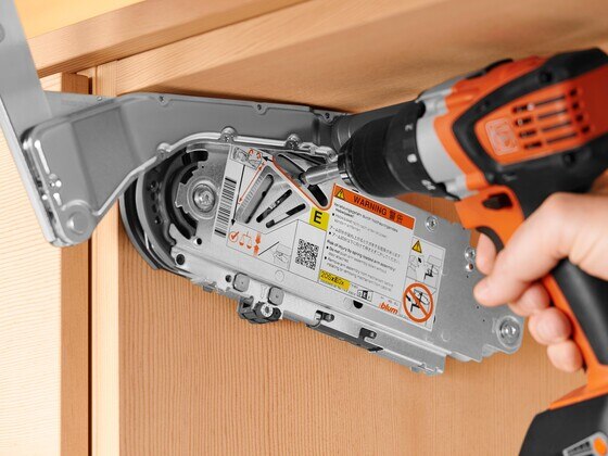 Komponenterne til AVENTOS HS er nemme at montere ved hjælp af CLIP-teknik. Justeringer er hurtigt foretaget i en håndevending. Hvis krafthuset er indstillet præcist efter vægt og størrelse på fronten, åbner, lukker og stopper AVENTOS HS altid pålideligt. For at lette transporten er dele, som rager ud aftagelige.