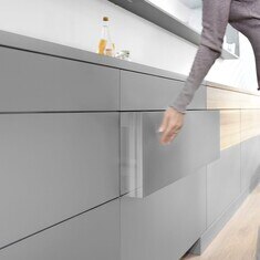 Skinnesystemet TANDEM udmærker sig ved et roligt, letkørende løb. Slidstærke kunststofruller sørger for, at skuffens vægt bliver bedre fordelt og der ikke opstår metalstøv. Takket være Blum-bevægelsesteknologi åbner og lukker skufferne stille og rolig.