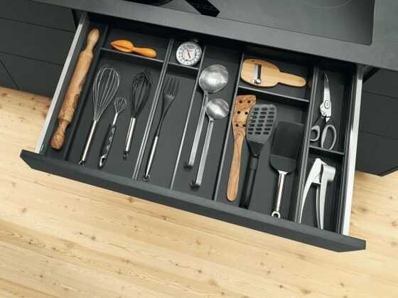 AMBIA-LINE dan ORGA-LINE dengan rapi menata isi laci dan tarikan. Keduanya menyimpan barang-barang dengan aman dan membuat isi laci terlihat jelas.