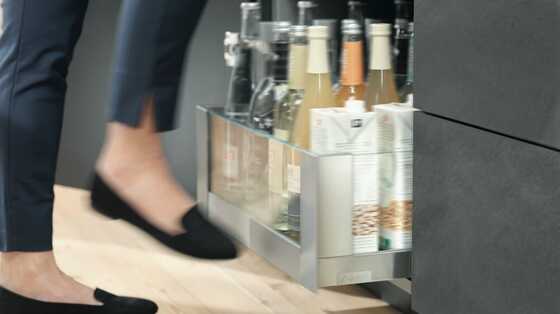 軽く押すだけで、フラップや引出し、食洗器、冷蔵庫や冷凍庫の扉などが SERVO-DRIVE によって簡単に開きます。引出しや前板の重さによって動作に影響が出ることはありません。そして BLUMOTION によって柔らかく静かに閉じます。
