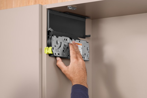 La última generación de AVENTOS HF top destaca tanto por su diseño compacto como por su ensamblaje y montaje sencillos, gracias a la posición de fijación firme del mecanismo de elevación y la fijación frontal sin importar la altura del cuerpo de mueble. Además, son posibles el ajuste BLUMOTION adaptable y el ajuste del mecanismo de elevación desde el frente incluso con la tapa montada.