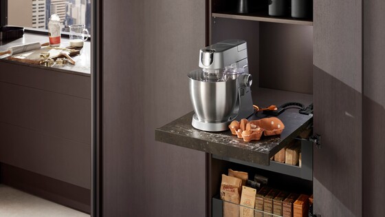 Thanks to the built-in power outlet, electrical appliances and devices can be tucked away in drawers or placed on pull-out shelves, freeing up space on the worktop. Worktops are kept free of clutter, with unsightly tangles of cables a thing of the past.