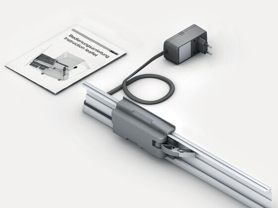 Set content: Pre-assembled SERVO-DRIVE unit plus bracket profile and attachments, drip protection, distance bumpers, 12 watt plug in transformer including cable, installation instructions and fitting template