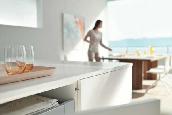 A single touch suffices - AVENTOS HK and AVENTOS HK-XS stay lifts open with ease. Users can then simply open up the fronts as far as desired. To close, simply press the lift system shut.