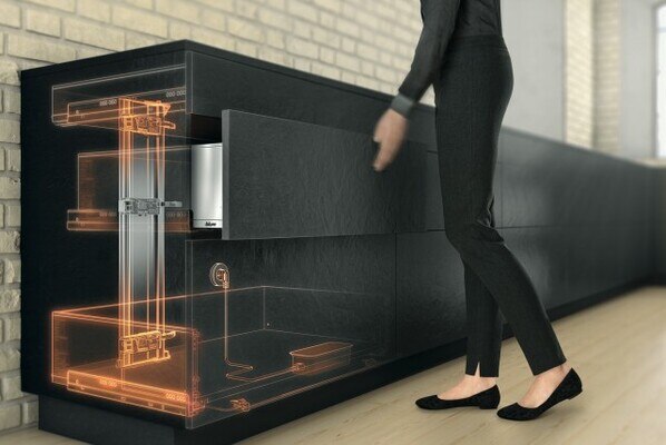 Um leve toque na frente é suficiente para abrir automaticamente portas de elevação com SERVO-DRIVE para AVENTOS. O fechamento ocorre eletricamente com facilidade ao se pressionar um interruptor. O amortecimento BLUMOTION garante um fechamento leve e silencioso.
