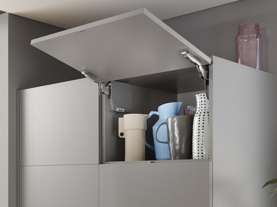 A ferragem integrada para portas de elevação se funde com o móvel – para ideias de móveis de alta qualidade.