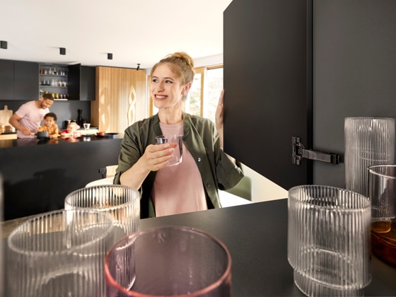 Mais possibilidades de composição: dobradiças para móveis em preto-ônix para superfícies escuras e claras em todos os ambientes.