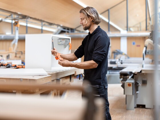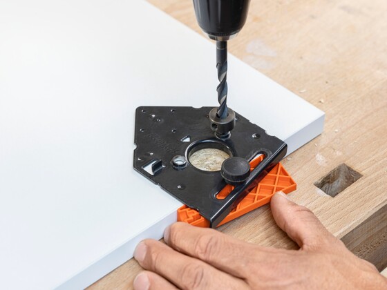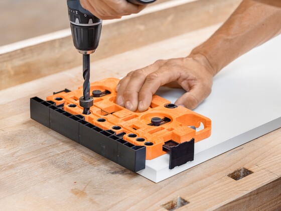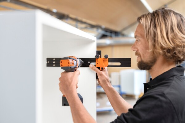 Auxílio otimizado no processamento de frentes, gabinetes e gavetas: com nossos ajudantes robustos, como o gabarito universal de furações, as posições de fixação podem ser previamente furadas com segurança e precisão.
