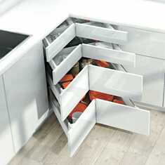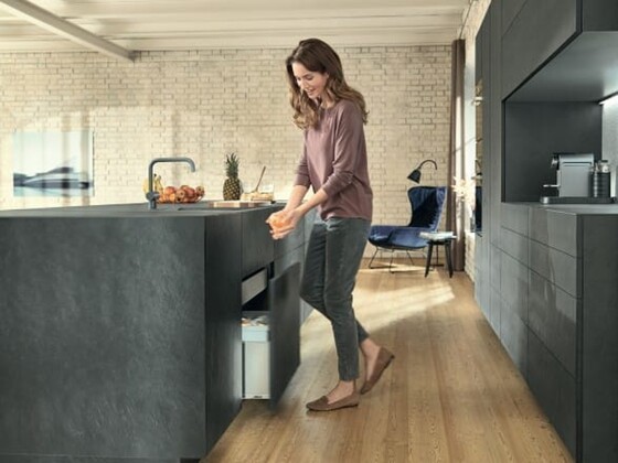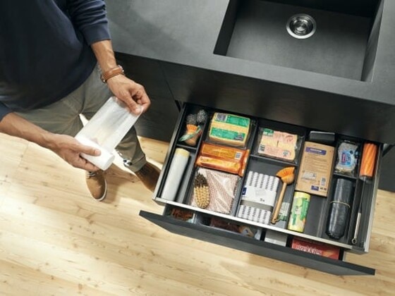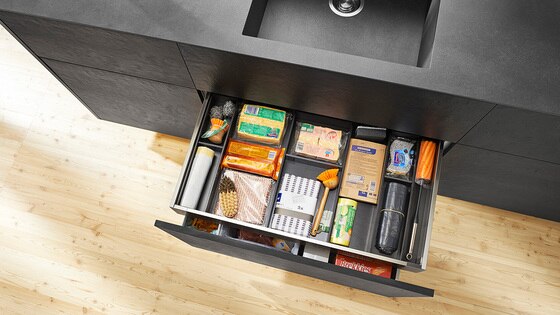 Especialmente junto ao armário da pia, as mãos ficam frequentemente ocupadas, molhadas ou sujas. Aqui o sistema elétrico de auxílio de abertura SERVO-DRIVE tem grande vantagem. Um leve toque com o joelho, o quadril ou o pé é suficiente para abrir a extensão. O SERVO-DRIVE também está disponível como solução individual - SERVO-DRIVE uno.