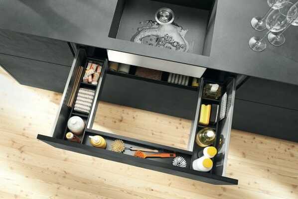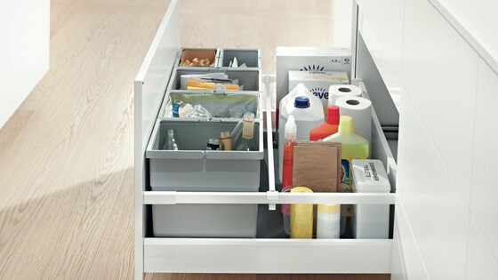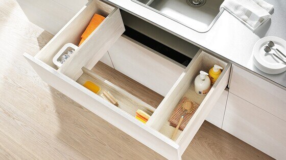 Na área da pia, o espaço disponível é especialmente valioso. Este armário de pia aproveita o espaço existente da melhor forma possível, garantindo, simultaneamente, acesso otimizado ao interior do armário. Assim, a bancada de trabalho permanece livre e os produtos de limpeza ficam rapidamente à mão. Este armário pode ser implementado com componentes Standard dos sistemas box LEGRABOX, MERIVOBOX e TANDEMBOX.
