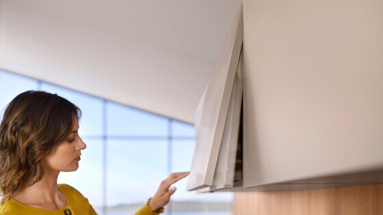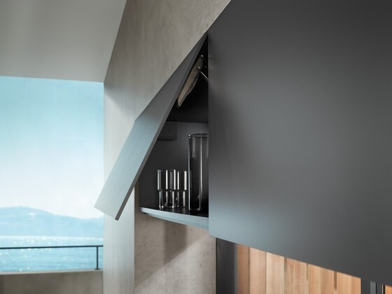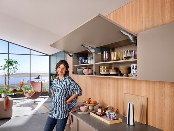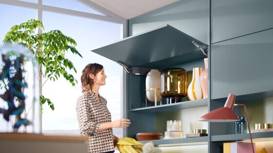 Caso haja pouco espaço sobre armários altos ou superiores, o AVENTOS HK top é a preferência. A porta de elevação quase não se projeta além do armário, de modo que um pé direito baixo não seja um obstáculo. Mesmo portas grandes e pesadas podem ser facilmente abertas com ela. Em frentes sem puxadores, as tecnologias de movimento SERVO-DRIVE e TIP-ON oferecem suporte elétrico e mecânico respectivamente.