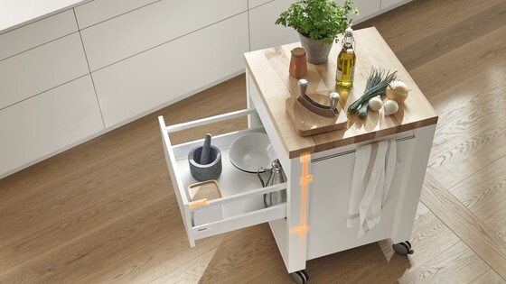 Seja para LEGRABOX, MERIVOBOX, TANDEMBOX, MOVENTO ou TANDEM – o sistema de fechamento abre muitas possibilidades de composições. Diversas larguras e alturas de armários, assim como várias alturas de extensões, podem ser realizadas.