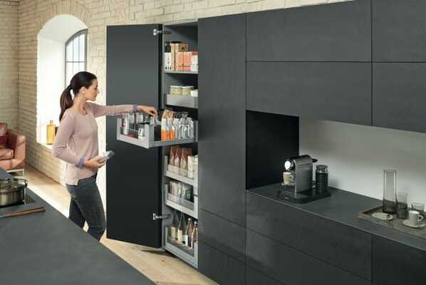 SPACE TOWER include toate feroneriile utilizate din programul standard. Pe lângă sistemele box LEGRABOX, MERIVOBOX sau TANDEMBOX antaro sunt posibile şi sertare de lemn echipate cu MOVENTO sau TANDEM. Acest lucru asigură un design uniform în întreaga bucătărie şi libertatea personalizării interiorului dulapului.