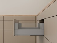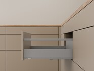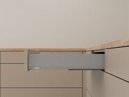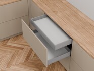 The innovative L-shape of the cabinet profile makes MERIVOBOX incredibly stable even when fully loaded. The new box system not only has a synchronized feather-light glide but also boasts high front stability, opening up new possibilities for kitchen design. High fronts can be easily combined with low drawer sides for a unique look.