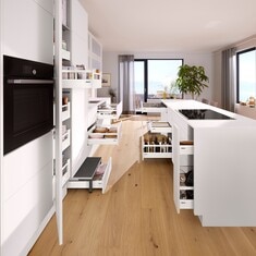 What sets MERIVOBOX apart is its distinctive drawer side design and clean, straight lines. The L-shaped runner system provides extra stability and load capacity for today’s busy kitchens. And the synchronized, feather-light glide and strong front stability open up new design possibilities.