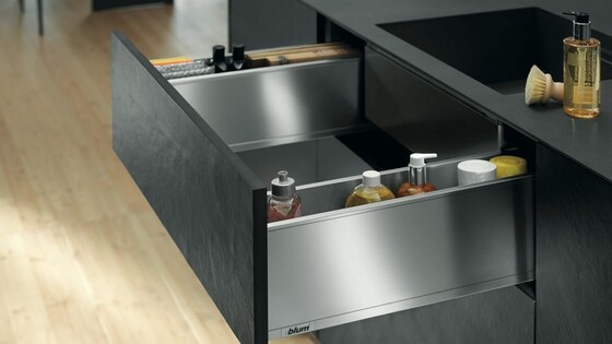 Storage under the sink is essential. This sink cabinet complete with sink drawers makes the most of every available inch, providing easy access to everything inside. It keeps countertops clear and ensures dish washing items are always within reach. Best of all, this solution can be created using standard LEGRABOX, MERIVOBOX and TANDEMBOX components.