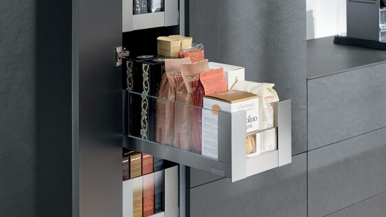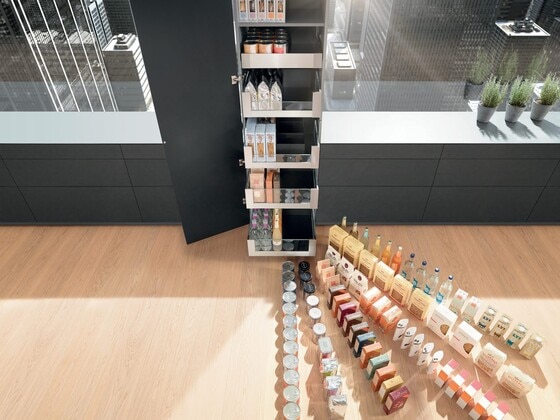 SPACE TOWER is Blum's idea for a pantry cabinet. It offers ample storage space, has individual inner drawers that can be tailored to your needs and provides easy access to storage items from all sides. It's the convenient and ergonomic way to store goods.