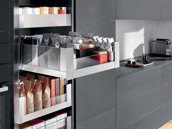 Transform a simple pantry unit into a SPACE TOWER with Blum box systems or drawer runners. Full extension drawers are ideal for making items easily accessible, and SPACE TOWER can be made as wide as needed to maximize storage capacity.
