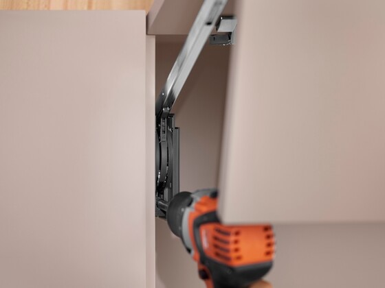 In addition to its more compact design, the latest generation AVENTOS HF top also impresses with simpler assembly and installation – thanks to the defined fixing position of the lift mechanism and front fixing bracket regardless of the cabinet height. What's more, the adaptive BLUMOTION adjustment and lift mechanism adjustment are possible from the front, even with the cover cap in place.
