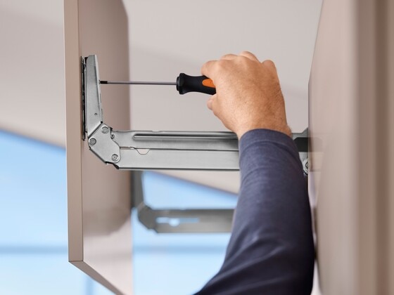 The straightforward AVENTOS HL range allows easy assembly and quick adjustments – thanks to the defined fixing position of the lift mechanism regardless of the cabinet height. Adaptive BLUMOTION adjustment and lift mechanism adjustment from the front (even with the cover cap in place) make assembly and installation easier than ever.
