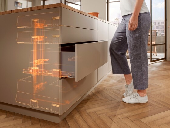 The adjustable trigger sensitivity works together with the integrated lean protection feature to prevent unintentional opening. What's more, the required opening force is automatically adjusted to the weight of the door or drawer, and several drive units can be synchronized to accommodate cabinet units with tall fronts.