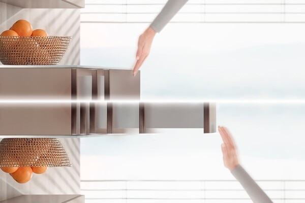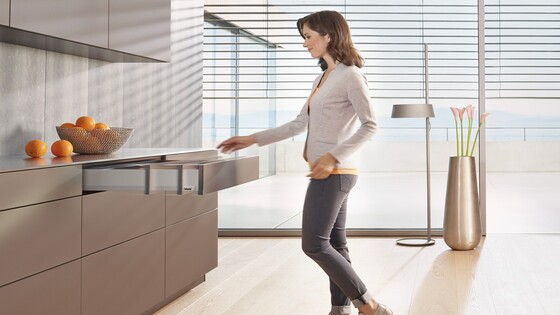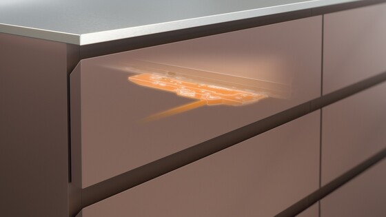 To incorporate handleless fronts in cabinets, simply combine MERIVOBOX with the TIP-ON BLUMOTION mechanical opening support system. This combination is possible thanks to the fully redesigned, innovative L-shaped cabinet profile of MERIVOBOX. Different TIP-ON BLUMOTION units are available to suit different nominal lengths and weight ranges. All other components are universal.