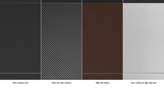 Thành ngăn kéo với tuỳ chọn màu đen carbon mờ kết hợp chất liệu với inox chống in dấu vân tay, kiểu dáng carbon 3D đặc biệt hoặc lớp hoàn thiện nâu đỏ nhám.